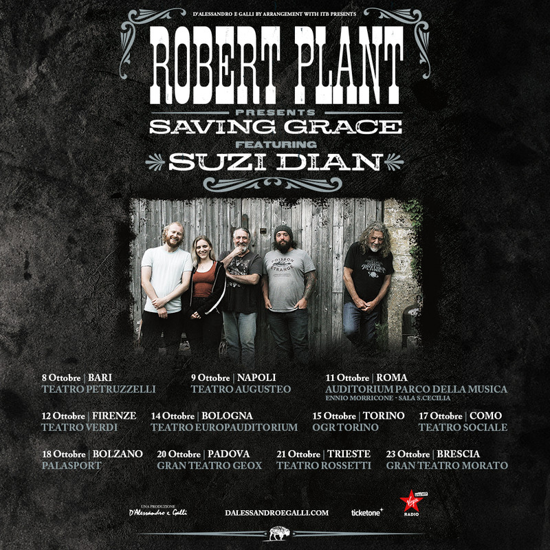 A pochi mesi dai trionfali sold out dell’ultimo tour estivo, Robert Plant ha annunciato 11 nuove incredibili date evento in Italia che copriranno tutto il mese di Ottobre e che lo vedranno protagonista insieme a Suzi Dian, del progetto Saving Grace.Il tour partirà l’8 Ottobre dallo storico Teatro Petruzzelli di Bari per poi toccare molti prestigiosi teatri italiani, da Napoli a Roma, da Firenze a Trieste, passando per Bologna, Torino, Como, Bolzano e Padova, e concludersi infine a Brescia il 23 Ottobre.
