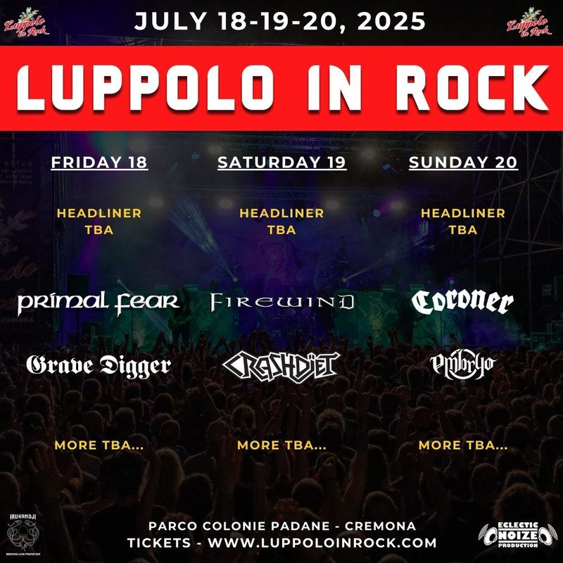 Firewind e Crashdïet saliranno sul palco del Luppolo in Rock sabato 19 luglio 2025, gli Embryo domenica 20 luglio 2025.